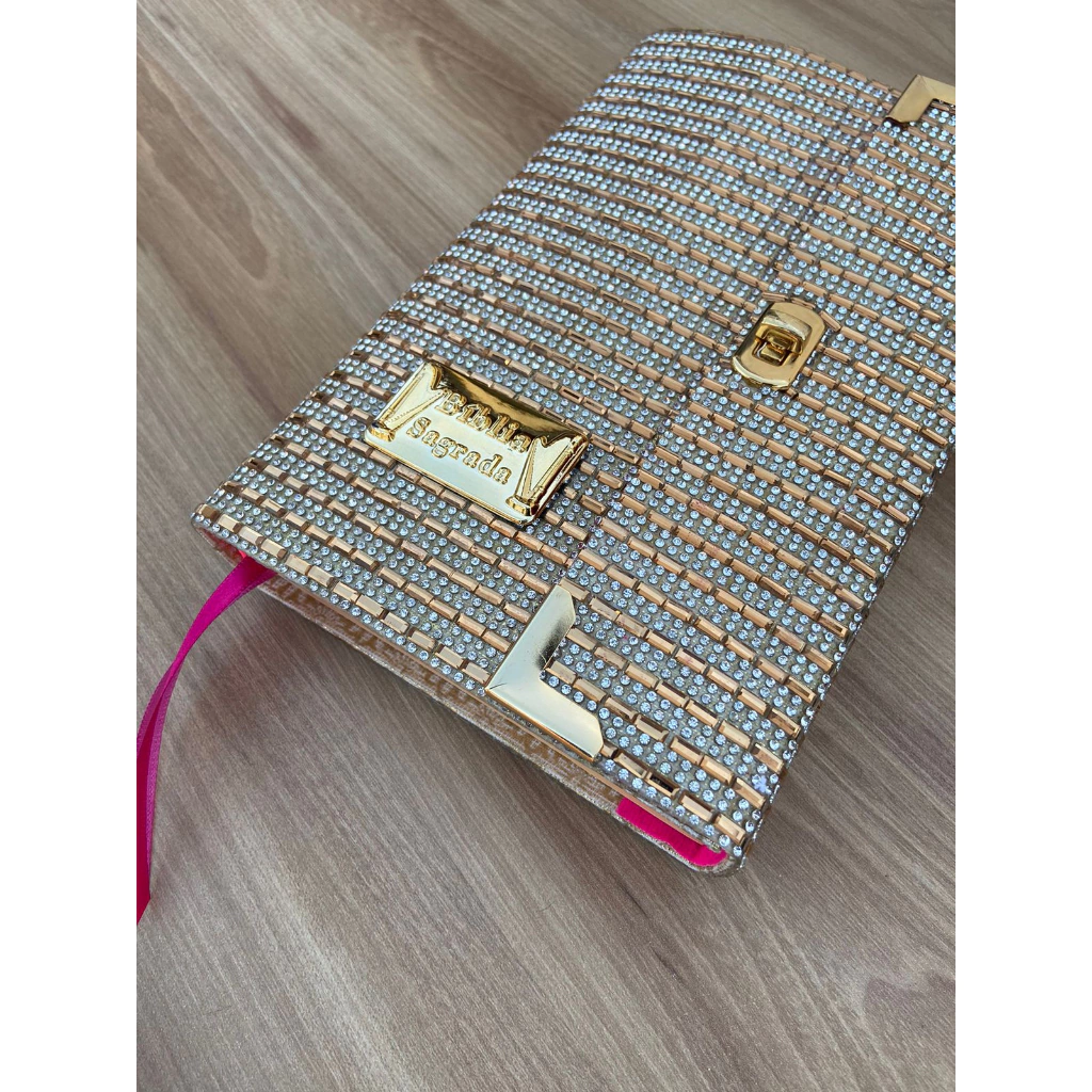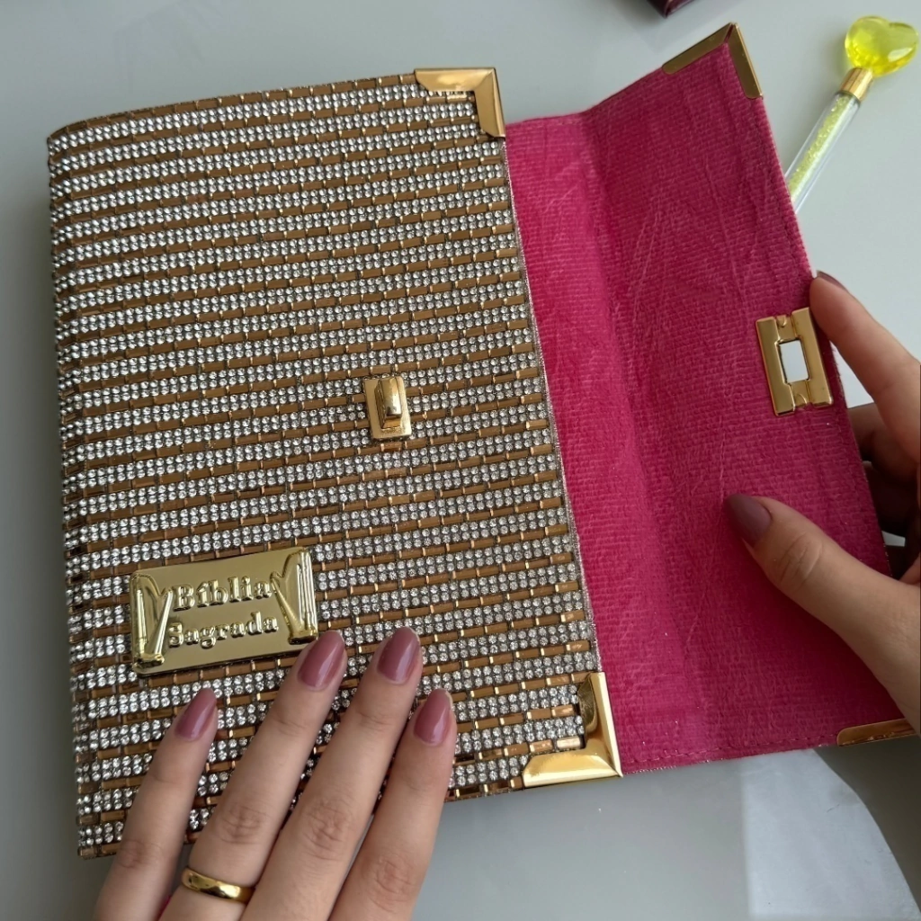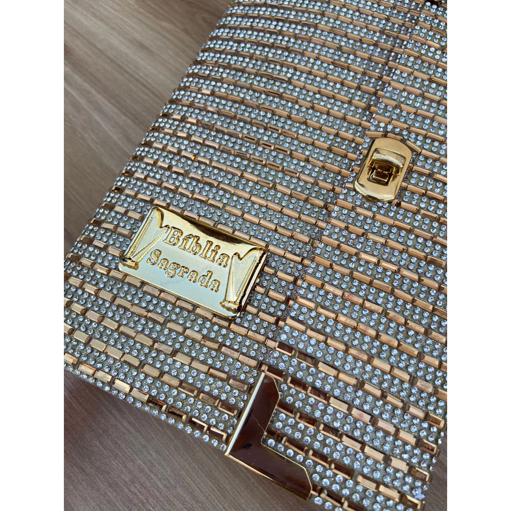 Bíblia com pedrarias dourada, cantoneiras luxo, plaquinha dourada e capa flexivel, em modelo carteira edição com harpa