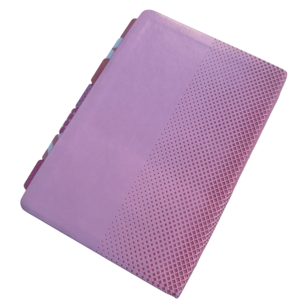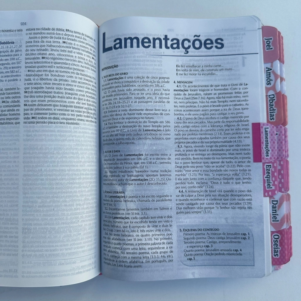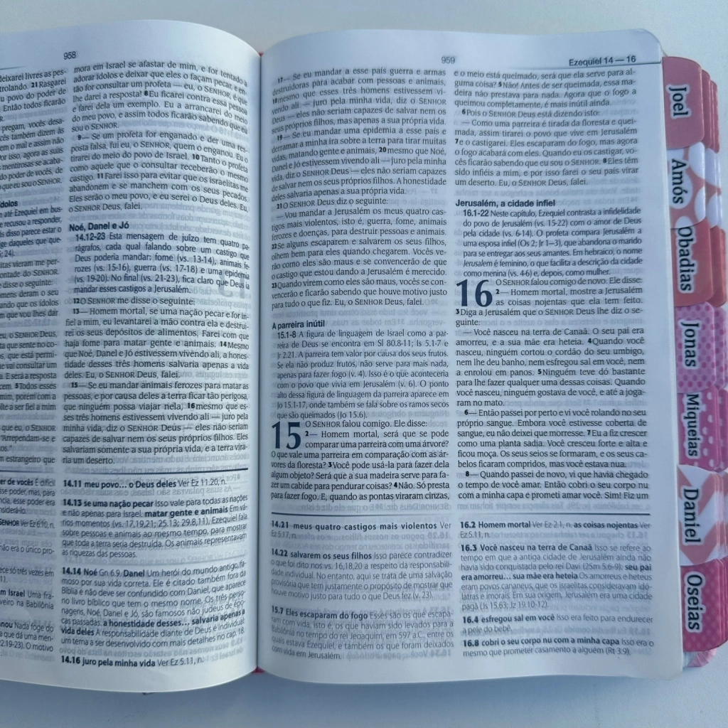 Essa Bíblia possui capa em couro bond, na cor rosa, a lateral da Bíblia é prateada, possui abas adesivas aplicadas para facilitar encontrar os livros da Bíblia rapidamente