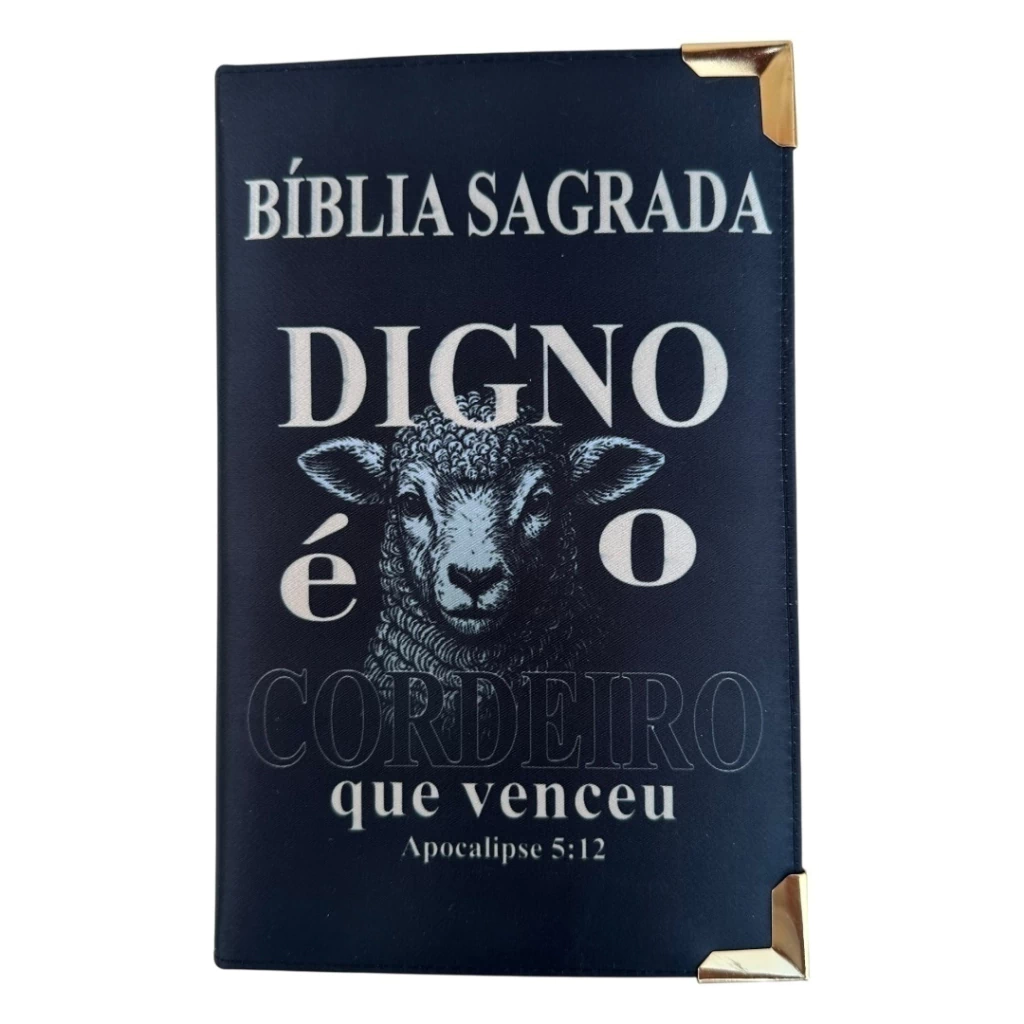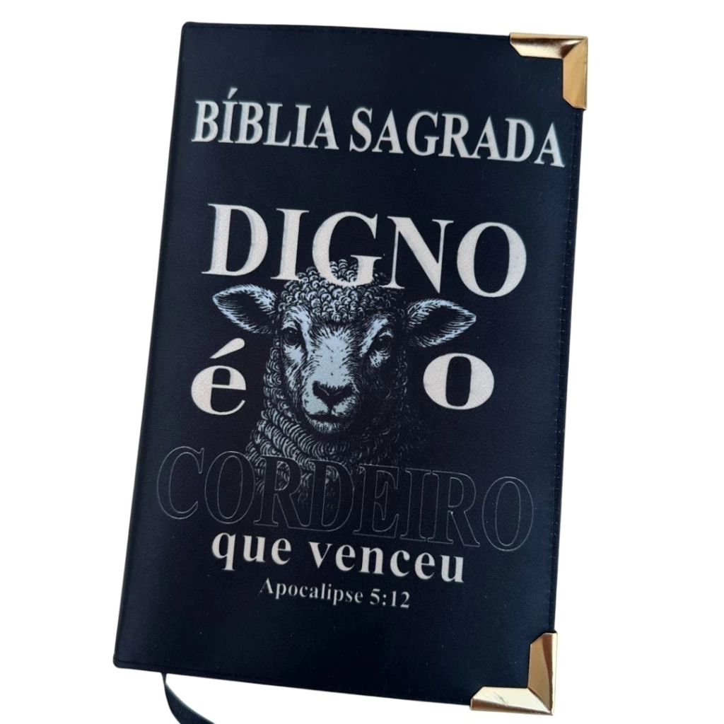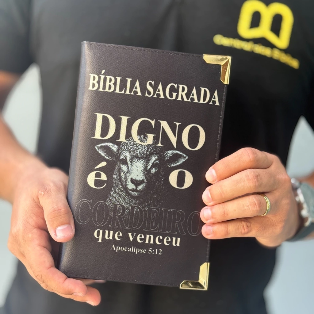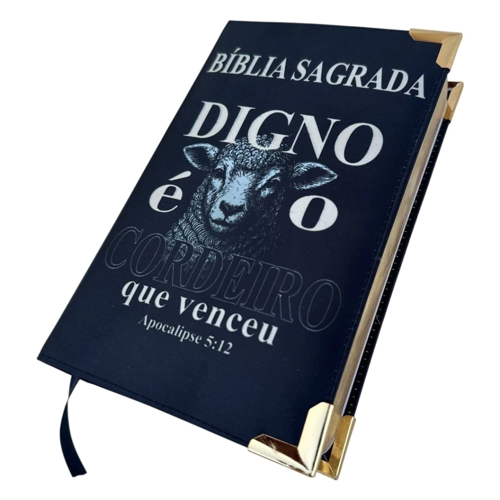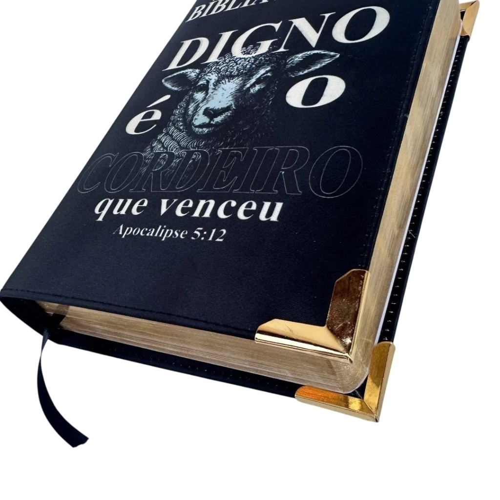 Bíblia com acabamento premium em corino cetim e costurada para alta resistência, com cantoneiras douradas e lateral da Bíblia também dourada, inspirada na passagem biblica de Apocalipse 5:12.