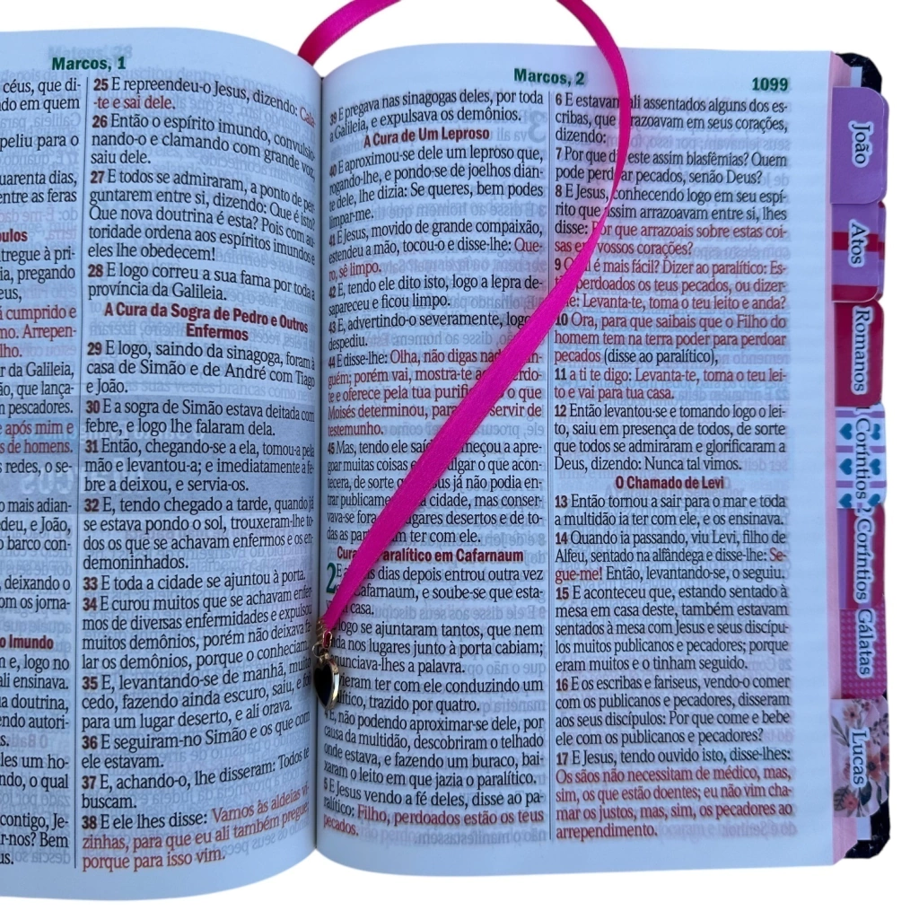 A Bíblia vai com as Abas adesivas aplicadas para auxiliar na procura dos livros