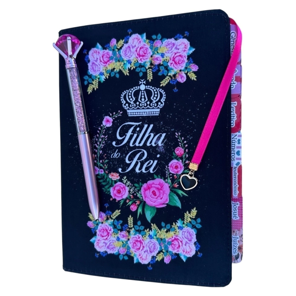 Bíblia em acabamento corino cetim e costurada para alta resistência, com frase Filha do Rei, possui a lateral da Bíblia na cor rosa com fitilho para marcação da passagem bíblica e abas dos livros