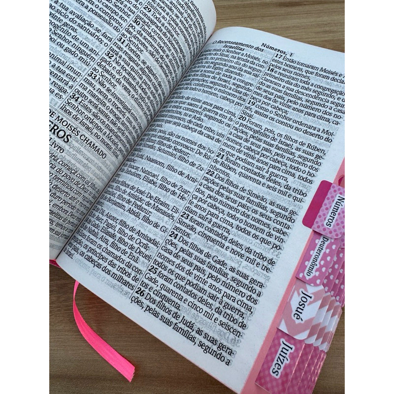 A Bíblia já vai com todas as 66 abas adesivas aplicadas para auxiliar na procura dos livros.