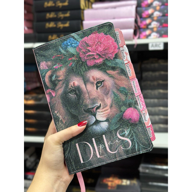 A capa é toda em glitter, acabamentos costurados para alta resistência, com leão de Judá na capa e nome Deus pai na frente da bíblia, a lateral dessa bíblia é na cor rosa e possui fitilho para marcação da passagem bíblica, assim você não perde a passagem em que está fazendo seus estudos.