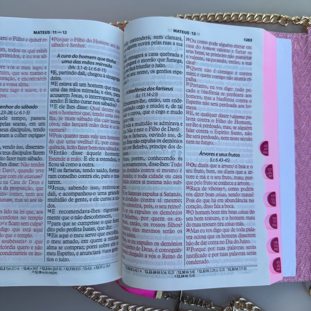 Desenvolvido por nossa equipe essa Bíblia possui acabamento premium com glitter 100%, bíblia costurada para alta resistência, com placa biblia sagrada dourada, possui 4 cantoneiras douradas, abotoadores dourados. A lateral da Bíblia é na cor rosa combinativa com a capa, com fitilho para marcação da passagem bíblica.