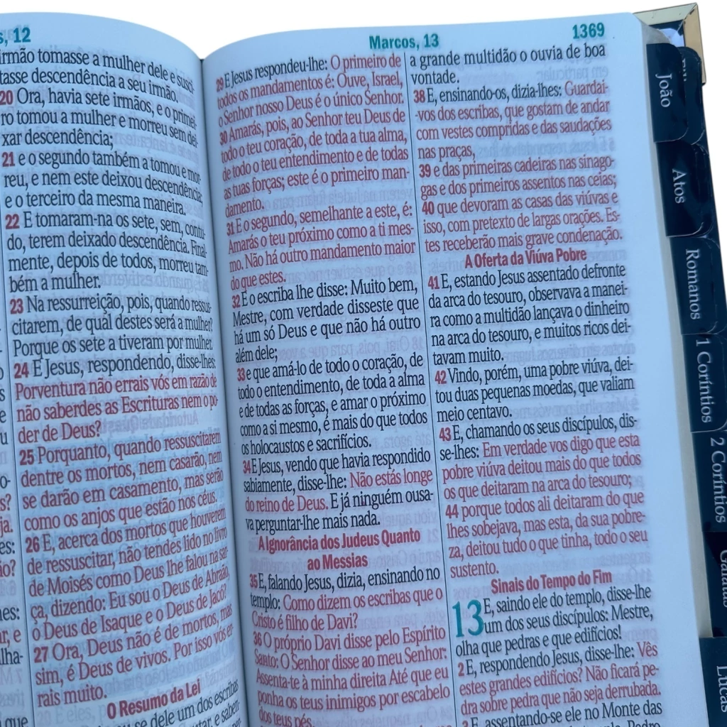 A lateral da Bíblia é dourada e possui fitilho para marcação da passagem bíblica.