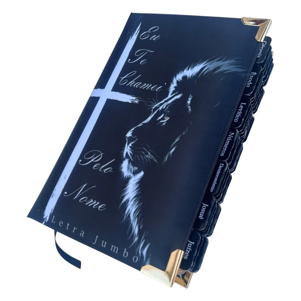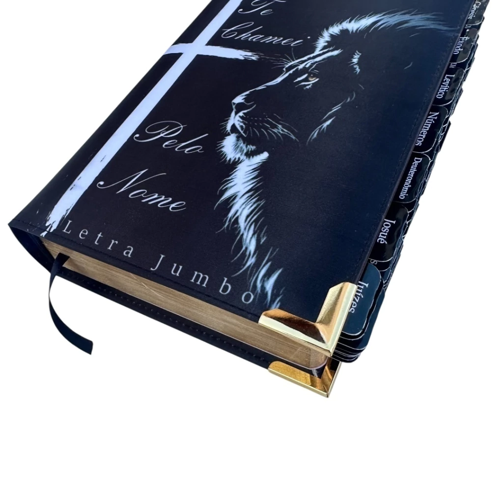 Acabamento em corino cetim e costurada para alta resistência, com abas adesivas e com cantoneiras douradas, leão de judá na capa