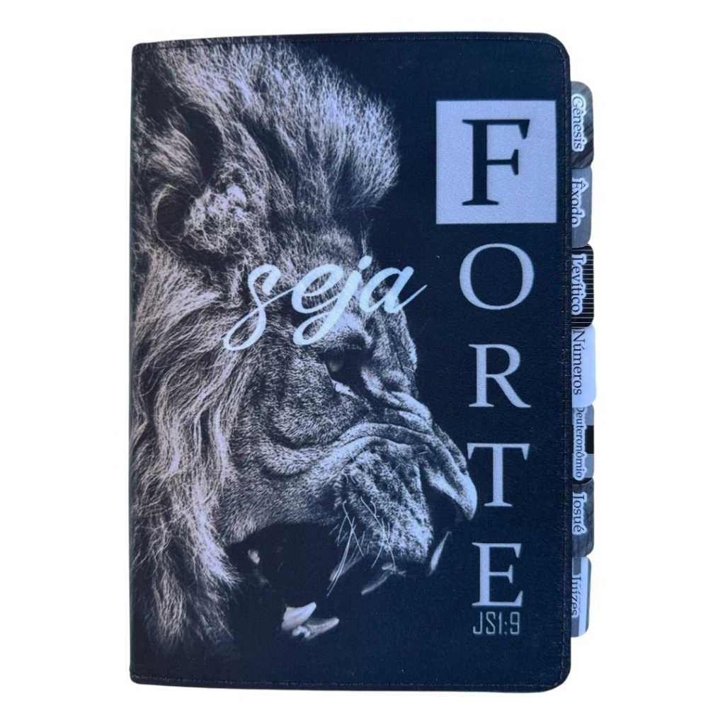 Preparamos com todo carinho esse exemplar para você. Possui acabamento premium com Abas adesivas coladas, com Leão de Judá e frase seja forte, a lateral da bíblia é na cor prata, além disso possui fitilho para marcação da passagem bíblica