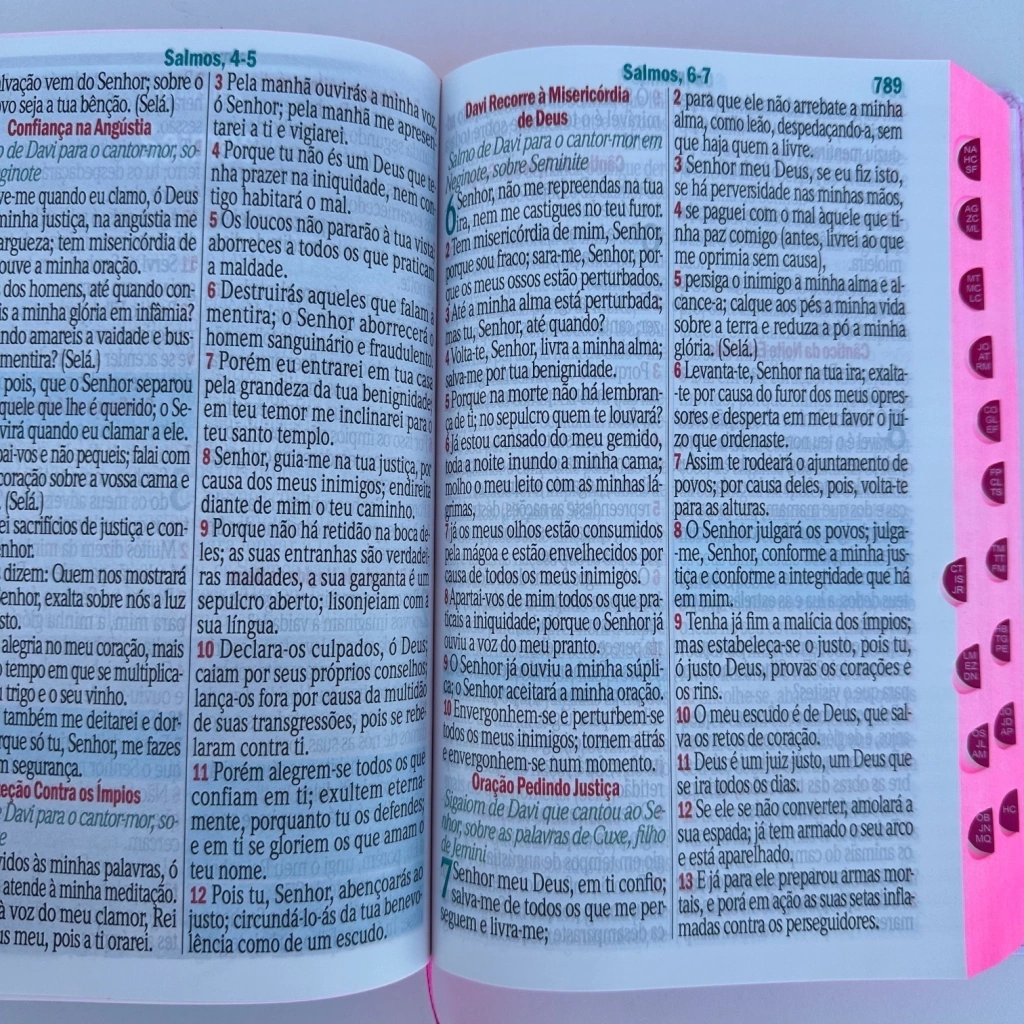Bíblia com acabamento em corino cetim e costurada para alta resistência, a lateral da Bíblia é na cor rosa, contém indice dos livros e fitilho para marcação da passagem bíblica.