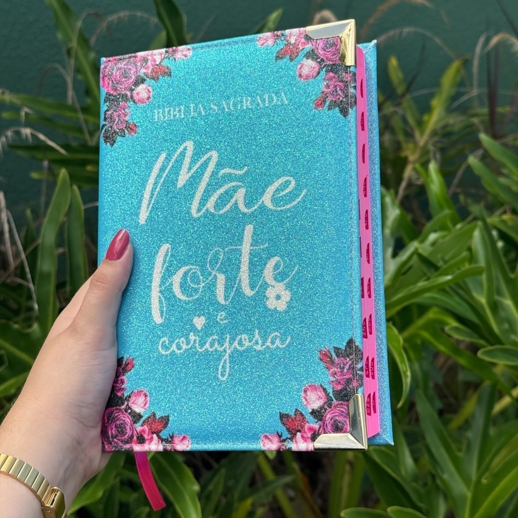 Capa pensada em cada detalhe, com acabamento 100% glitter em capa dura acolhoada e cantoneiras douradas, com frase Mãe Forte e corajosa, inspirada na passagem Josué 1:9 . A lateral da Bíblia é na cor rosa, contém fitilho para marcação da passagem bíblica.