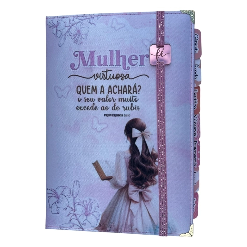 Bíblia em acabamento corino cetim e costurada para alta resistência, inspirada na passagem de pv 31:10, possui a lateral da Bíblia na cor rosa com fitilho para marcação da passagem bíblica e abas dos livros