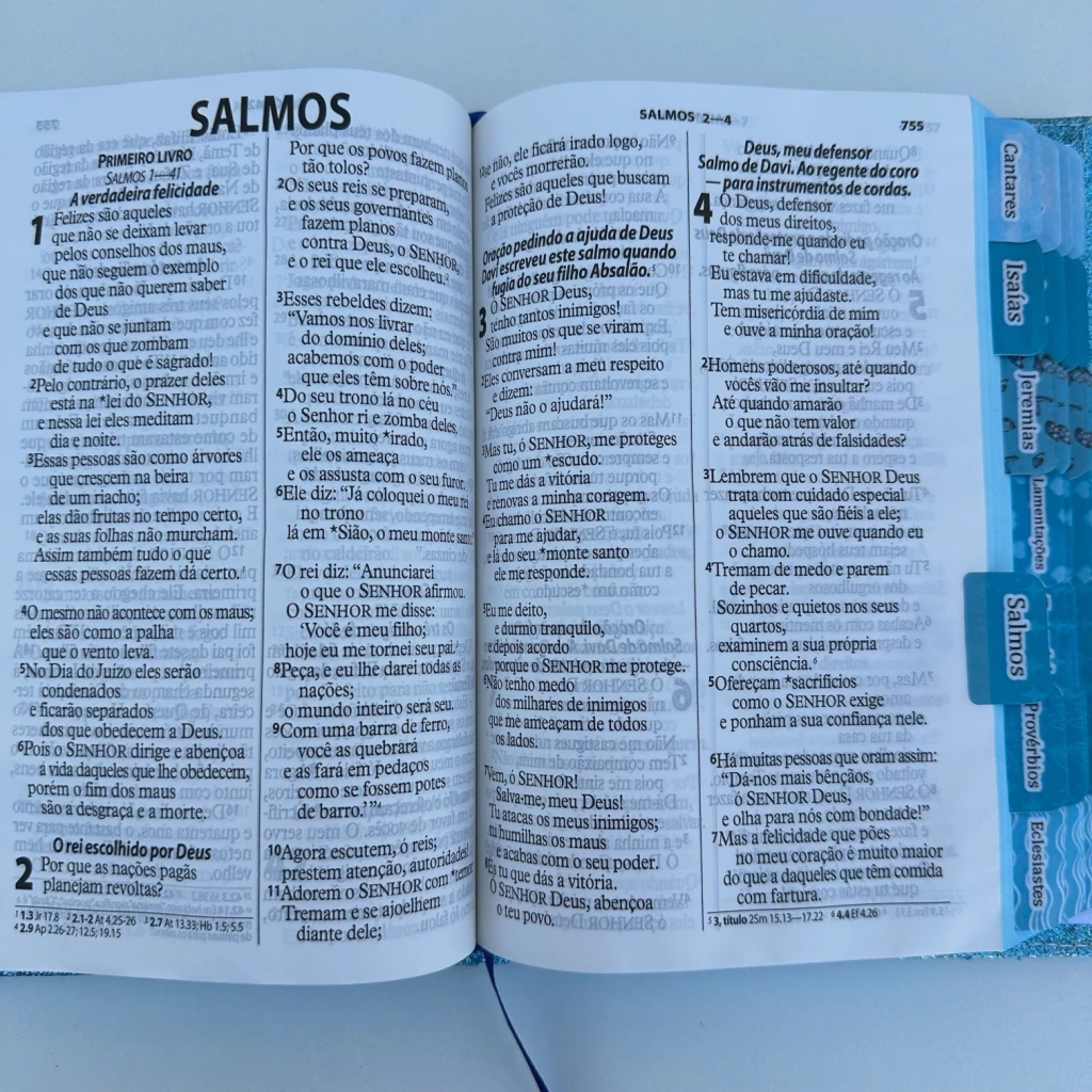 A Bíblia vai com Abas adesivas aplicadas para auxiliar na procura dos livros