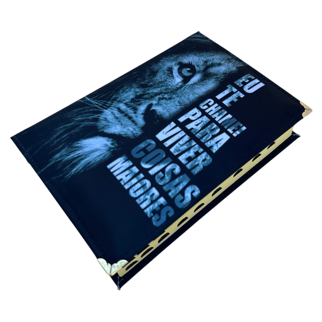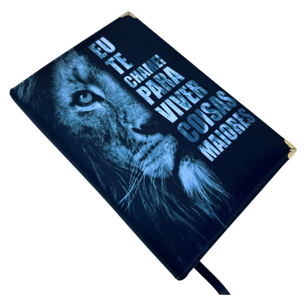 Bíblia Ntlh Eu te chamei. Acabamento em capa dura acolchoada em corino cetim e costurada para alta resistência, com leão de judá e cantoneiras gold. A lateral da Bíblia é prateada com fitilho para marcação da passagem bíblica.