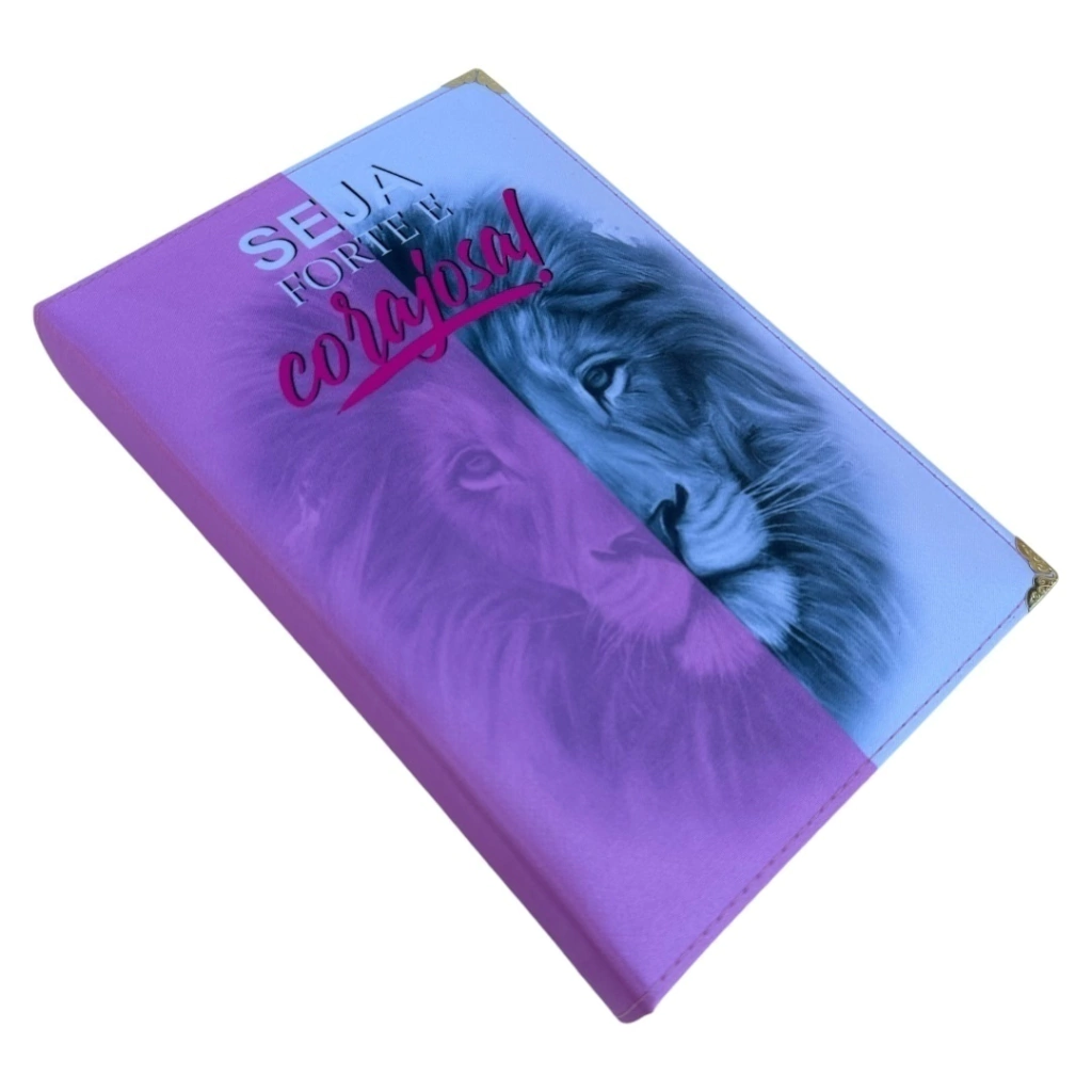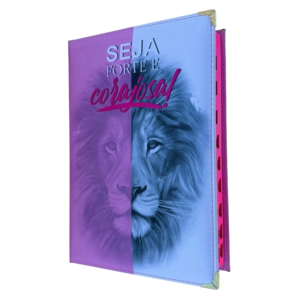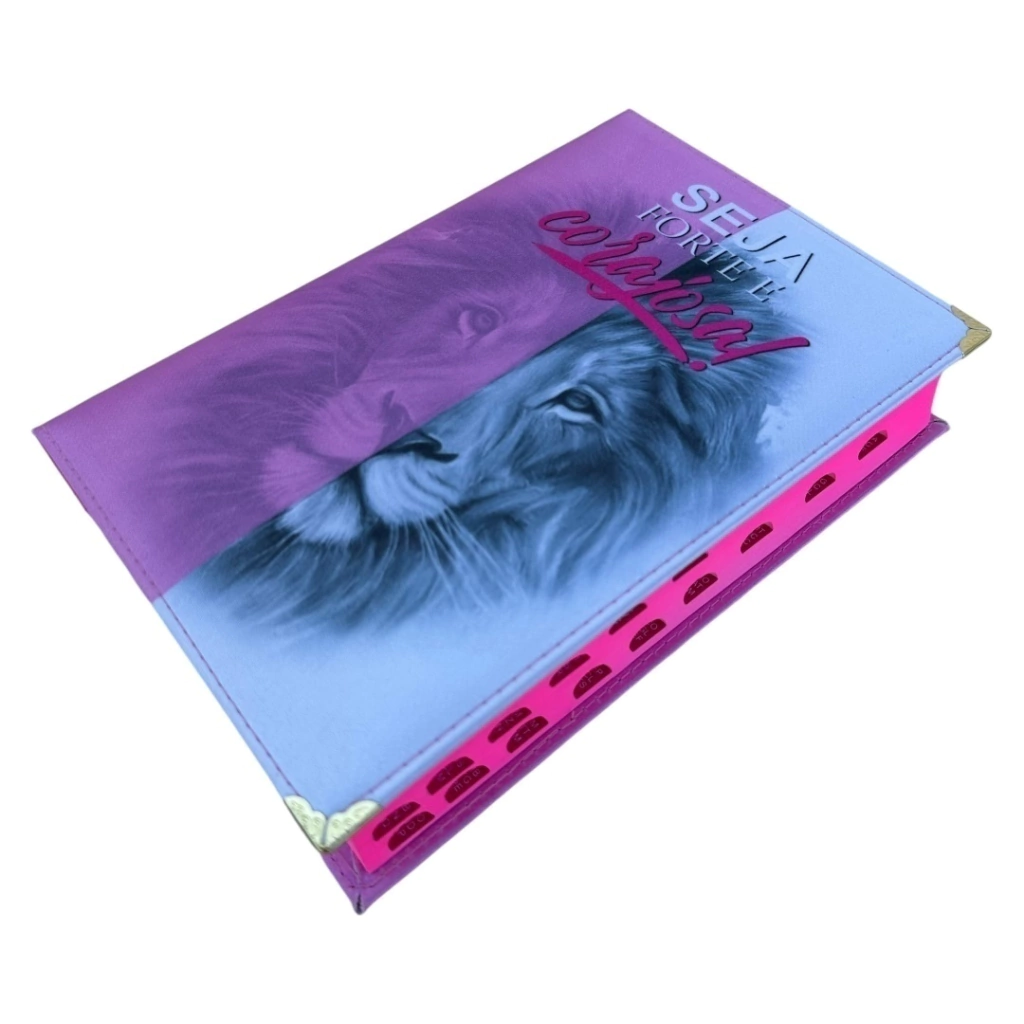 Bíblia ntlh leão faces rosa. A capa é dura acolchoada em corino cetim e costurada para alta resistência, na cor rosa com branco e leão da tribo de judá, possui cantoneiras gold. A lateral da Bíblia é na cor rosa com fitilho para marcação da passagem bíblica.