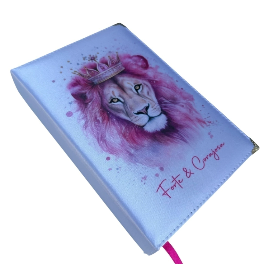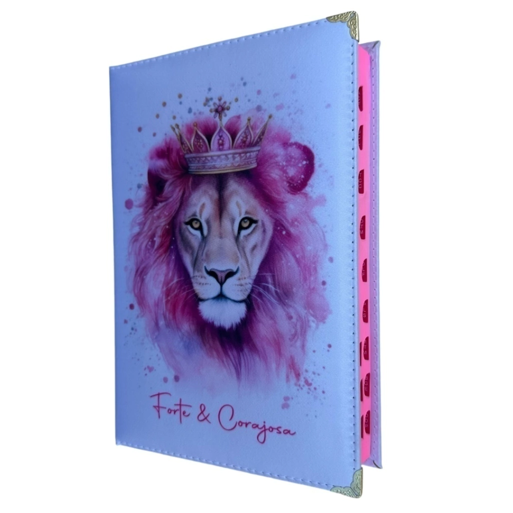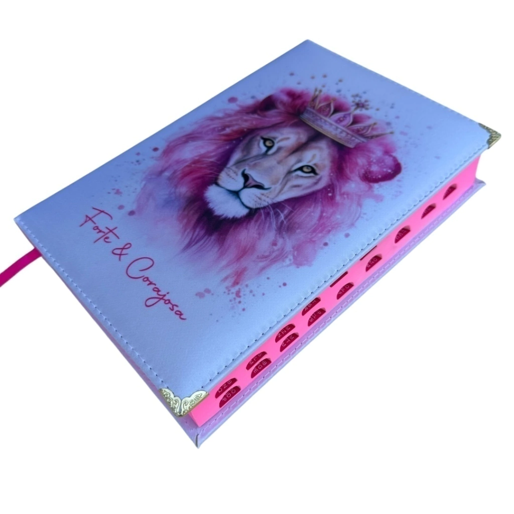 Preparamos a Bíblia Ntlh Leão forte e corajosa. Acabamento em capa dura acolchoada em corino cetim e costurada para alta resistência, com cantoneiras gold e leão na capa. A lateral da Bíblia é na cor rosa com fitilho para marcação da passagem bíblica.