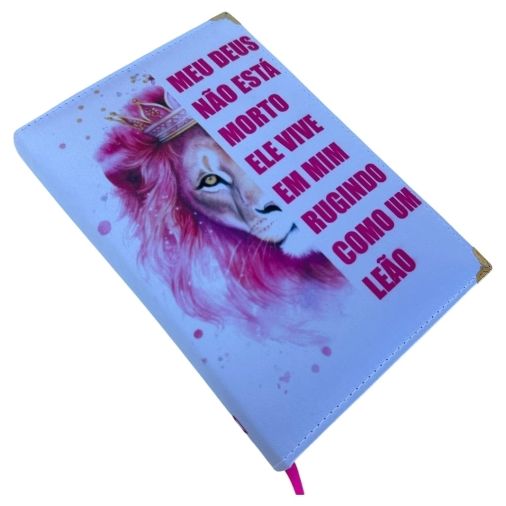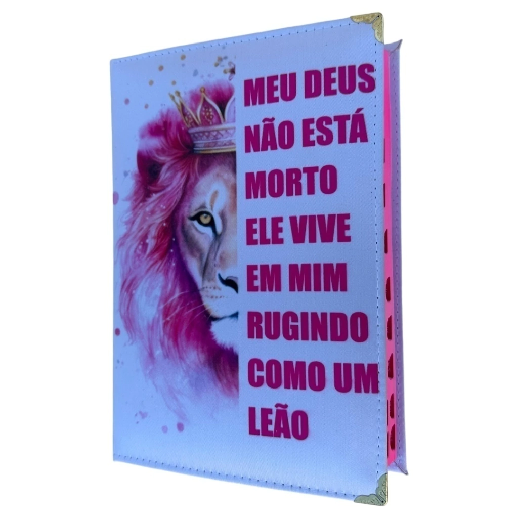 Bíblia Ntlh Leão. A capa é dura acolchoada em corino cetim e costurada para alta resistência, com cantoneiras gold. A lateral da Bíblia é na cor rosa com fitilho para marcação da passagem bíblica.