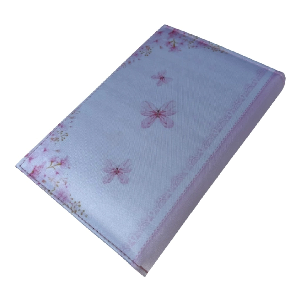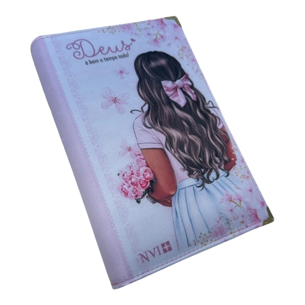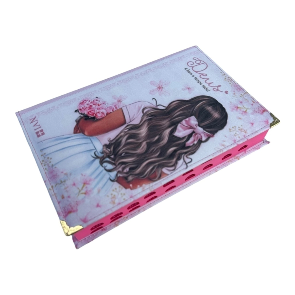 Bíblia NVI Garota. A capa dura acolchoada em corino cetim e costurada para alta resistência, com cantoneiras gold. A lateral da Bíblia é na cor rosa com fitilho para marcação da passagem bíblica.