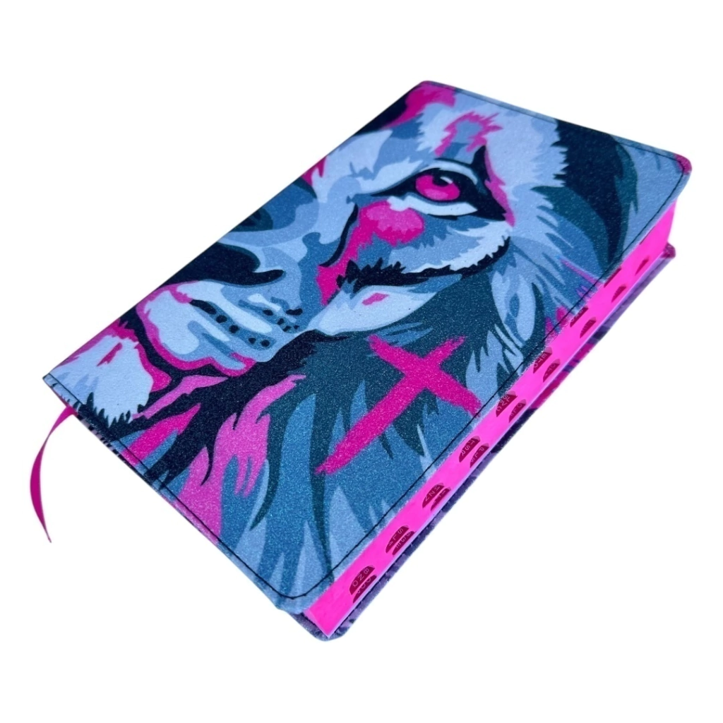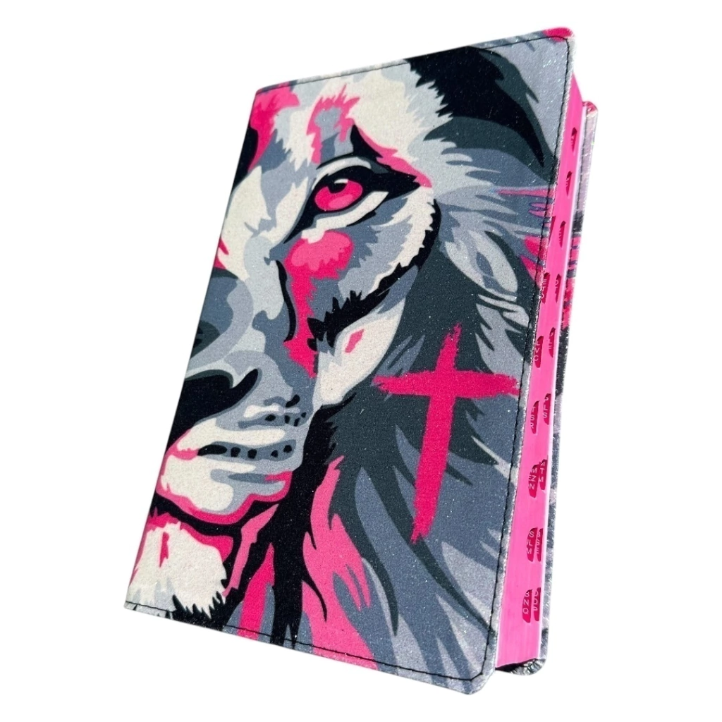Bíblia 100% Glitter Leão Rosa com indice.