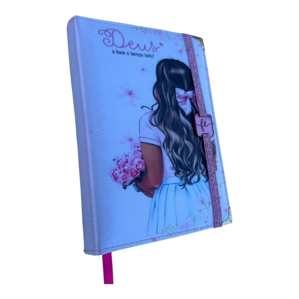 Bíblia com acabamento em capa dura acolchoada costurada para alta resistência com cantoneiras douradas, possui lateral rosa e indice digital, também possui elástico rosa e placa acrilica com nome Fé, capa com garota e frase Deus é bom o tempo todo