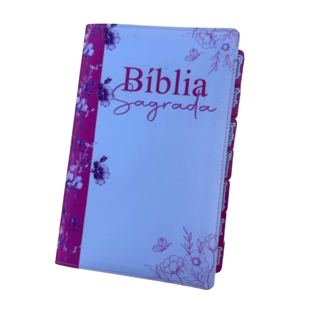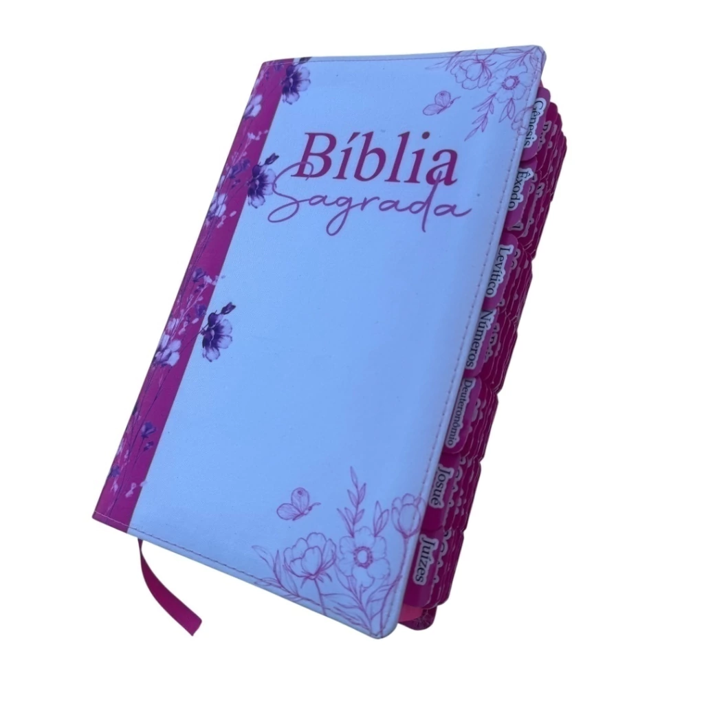Acabamento premium, corino cetim costurado para alta resistencia. Bíblia com lateral da bíblia na cor rosa, possui fitilho de marcação e abas adesivas aplicadas.