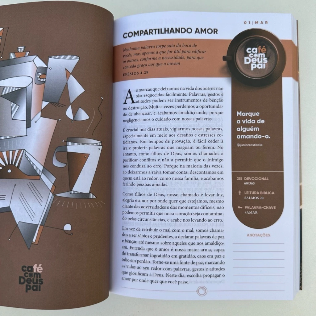 São 366 mensagens que te levarão a uma jornada com devocionais diários ao longo do ano, onde você é convidado a ter um encontro com Deus Pai.As páginas interativas irão envolvê-lo ainda mais nessa jornada, permitindo que você reflita, anote suas inspirações e compartilhe suas experiências.