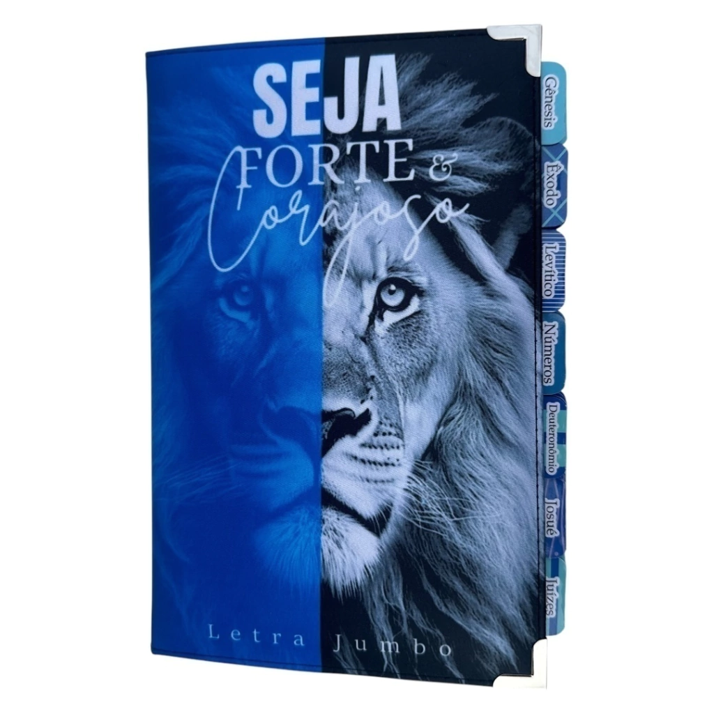Bíblia com acabamento em corino cetim e costurada para alta resistência, capa dura acolchoada, com leão de judá e frase Seja forte e corajoso, a lateral da Bíblia é na cor prata, contém abas adesivas aplicadas e fitilho para marcação da passagem bíblica.